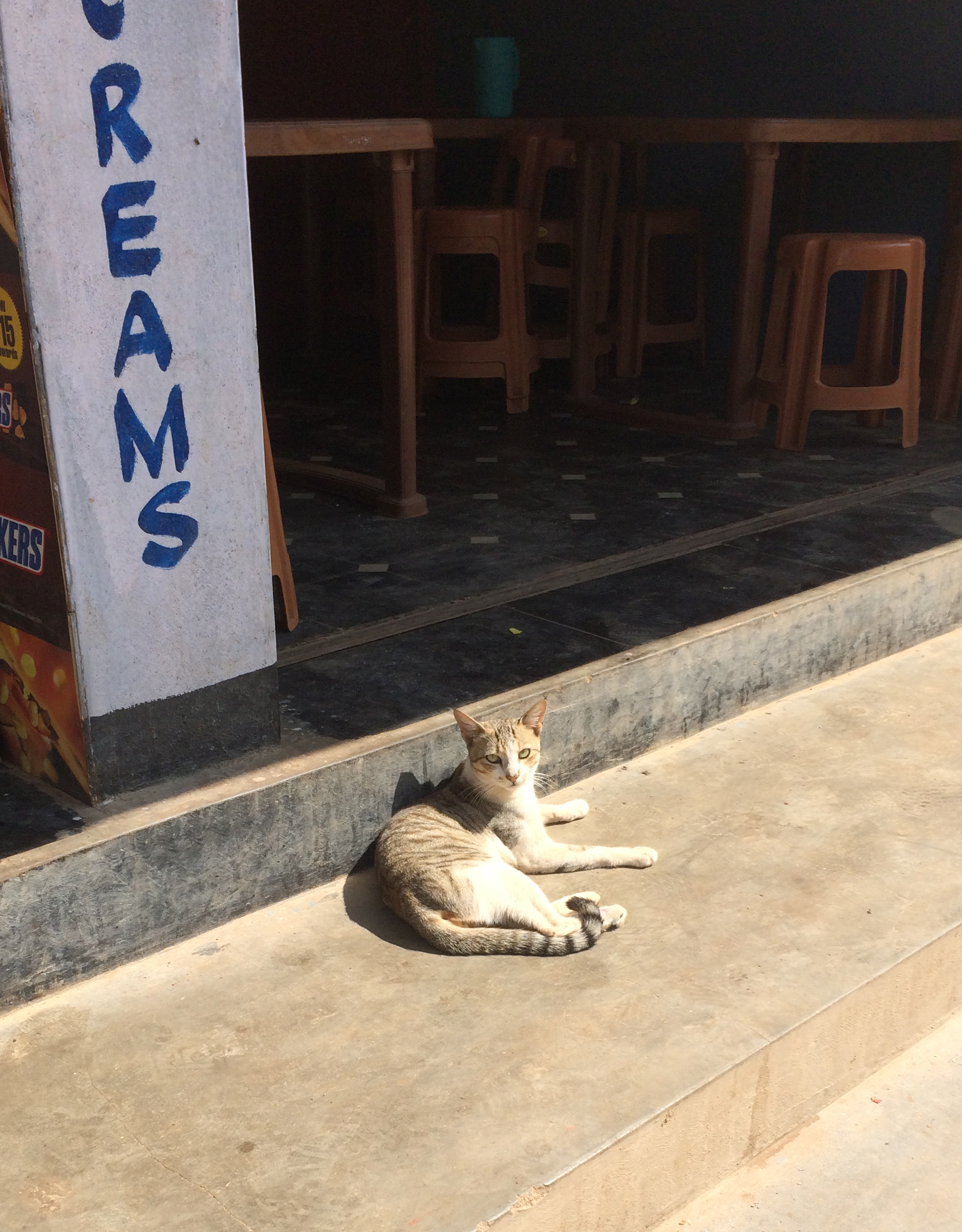 We walk, slowly, since walking in this country requires focus. Two little girls about 11 years old ride by on a pink bicycle. I smile, they smile. And giggle. And ride along. And they come back, stare and giggle some more. The one on the back is a little bit braver and says hi. We respond and wave. We meet them a bit later at the village square and they are still staring at us, smiling. It’s obvious they are following us. That’s cute. We go on. And poof, 50 feet away, here she is again, off the bike, alone. Hello. Hi, what is your name? My name is Shanti. Hi Shanti, my name is A. Hi, what village are you from? I live at the (insert here name of the housing complex where we live). Your English is very good. Thank you. And she runs back to her friend.