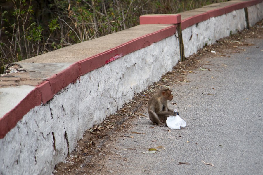Searching for food, and eating the plastic bag too.